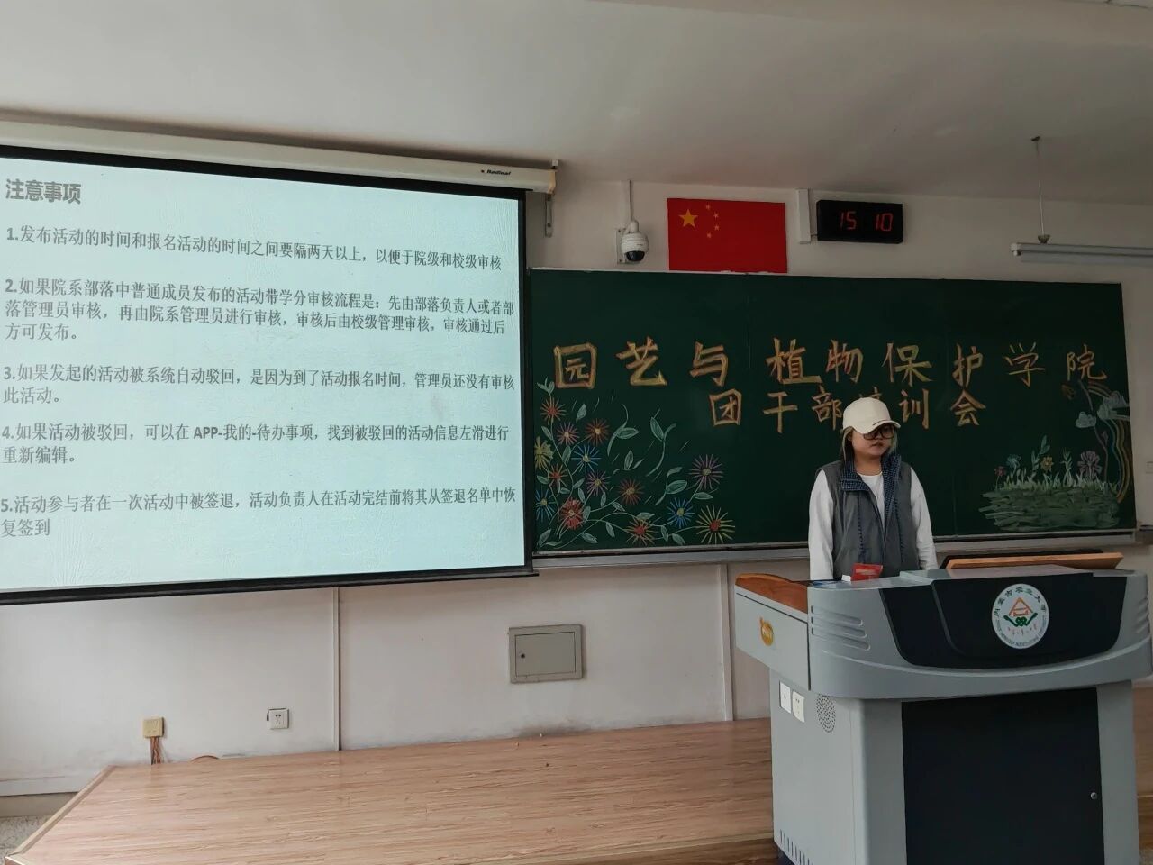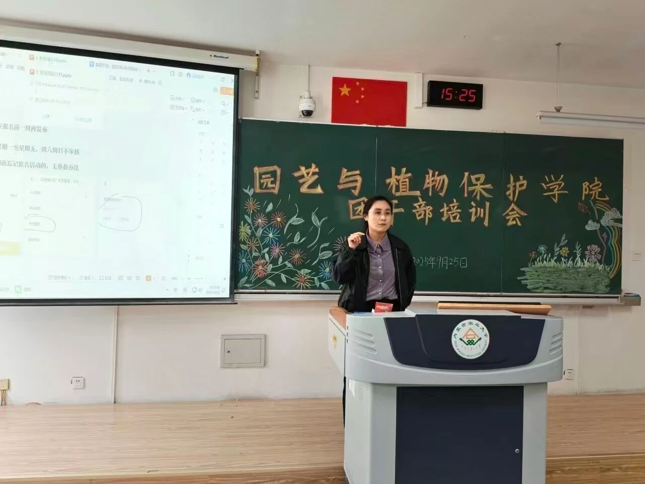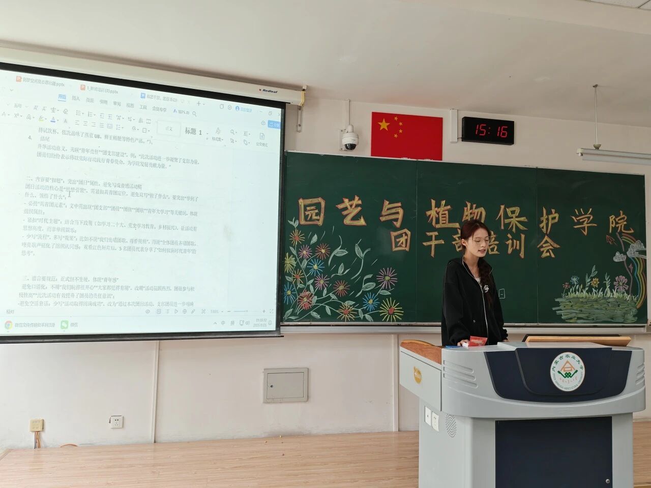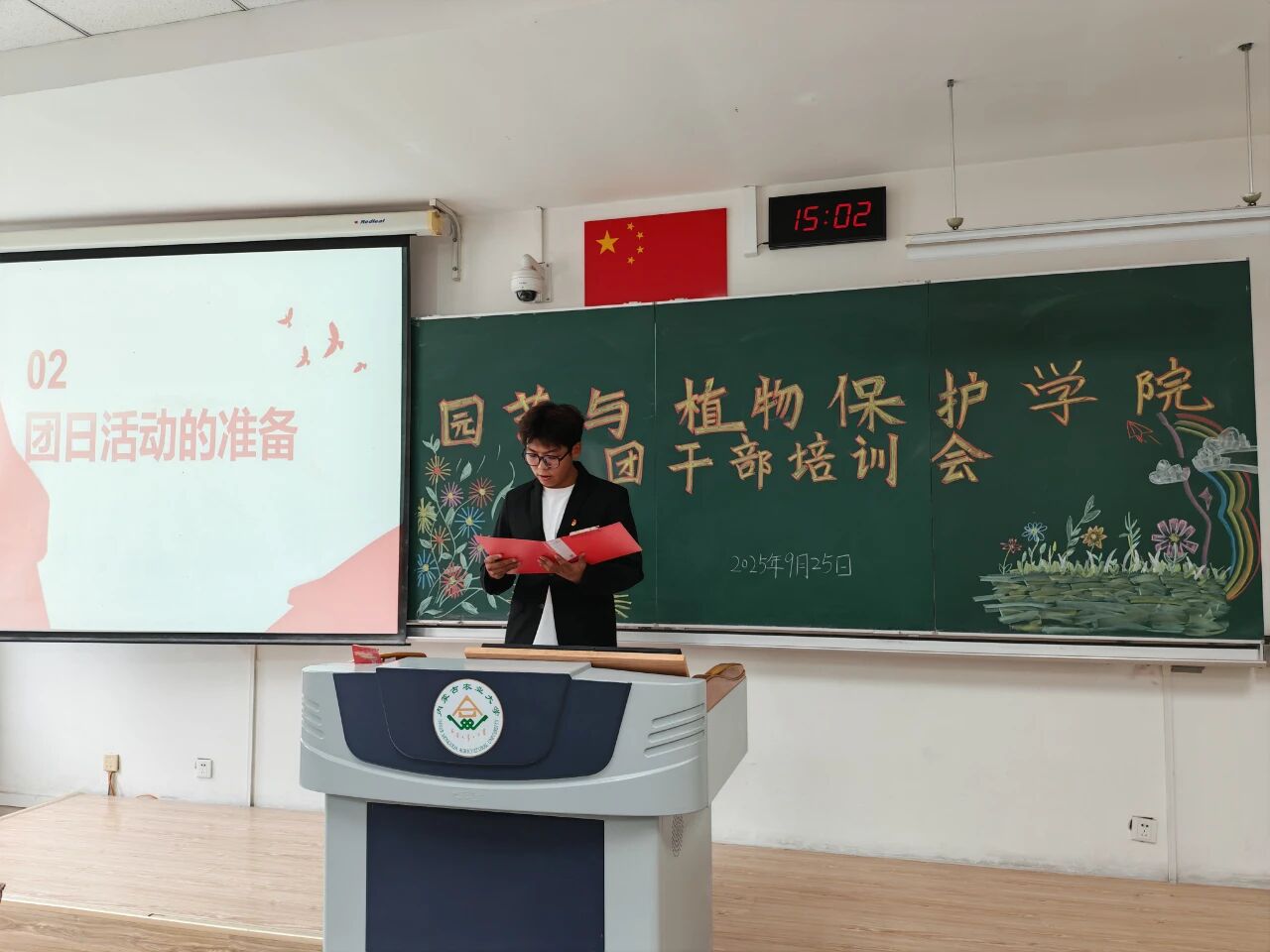 为明确团干部的职责与工作内容,充分发挥其在班级中的带头作用,9月25日下午,我院于南教221教室举行了团干部培训会。团委老师郝凤英出席本次会议,2025级全体团干部参加,会议由24级园艺二班张好同主持。