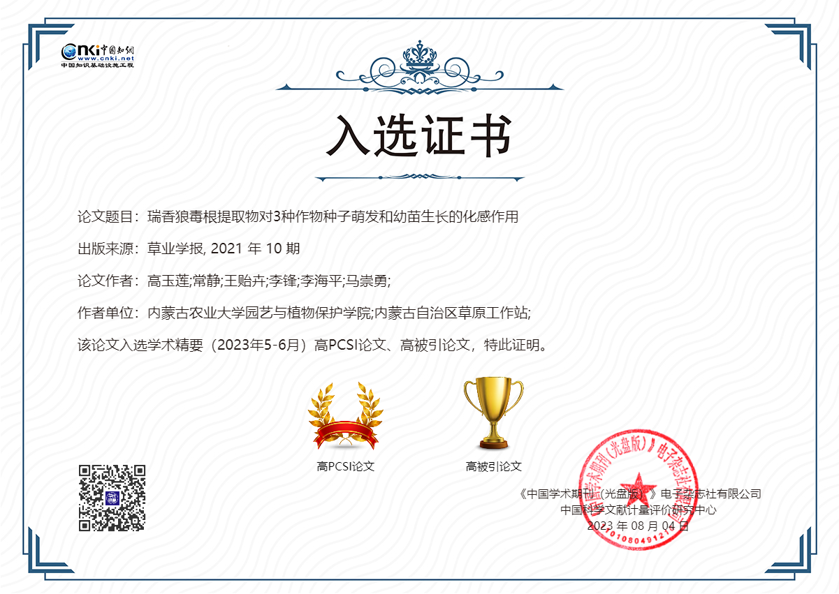 近日,中国科学技术信息研究所(中信所)发布了2024年度“领跑者5000——中国精品科技期刊顶尖学术论文(F5000)”入选名单,我院李海平教授团队发表在《草业学报》的论文 “瑞香狼毒根提取物对3种作物种子萌发和幼苗生长的化感作用”入选2024年度F5000论文名单。