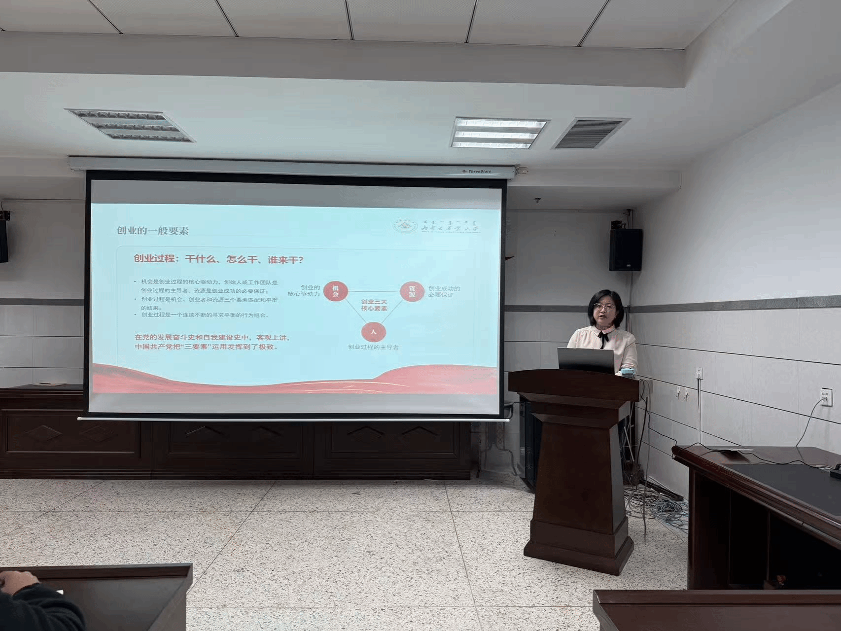 在课堂开始时,尤丽老师巧妙地引用中国共产党的建立,展开本次课程的讲授。她首先以中国共产党创业之初的艰难为切入点讲述了中国共产党“创”的是“国家和民族大业”、“共产主义伟业”,这是一种超脱一般境界的“业”,是崇高的、光荣的、严肃的、伟大的,所以跟党学创业不能用单纯的经济学理论去理解,不能用世俗化和庸俗化的方法去学习。她指出我们并不是简单的和中国共产党学“如何创业”,而是要透过党的百年历史,从它的奋斗史中汲取指导我们日常实践的精神、动力和方法。