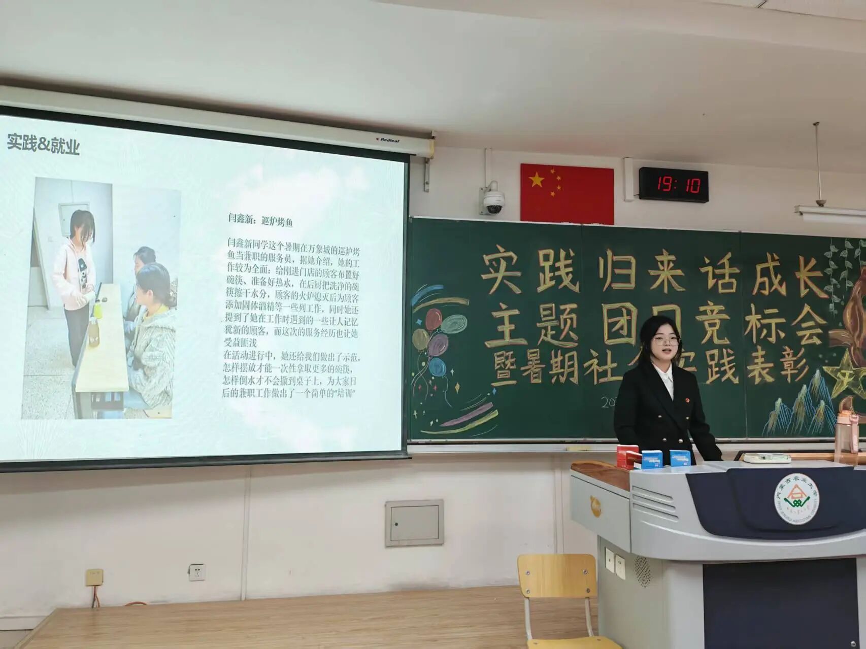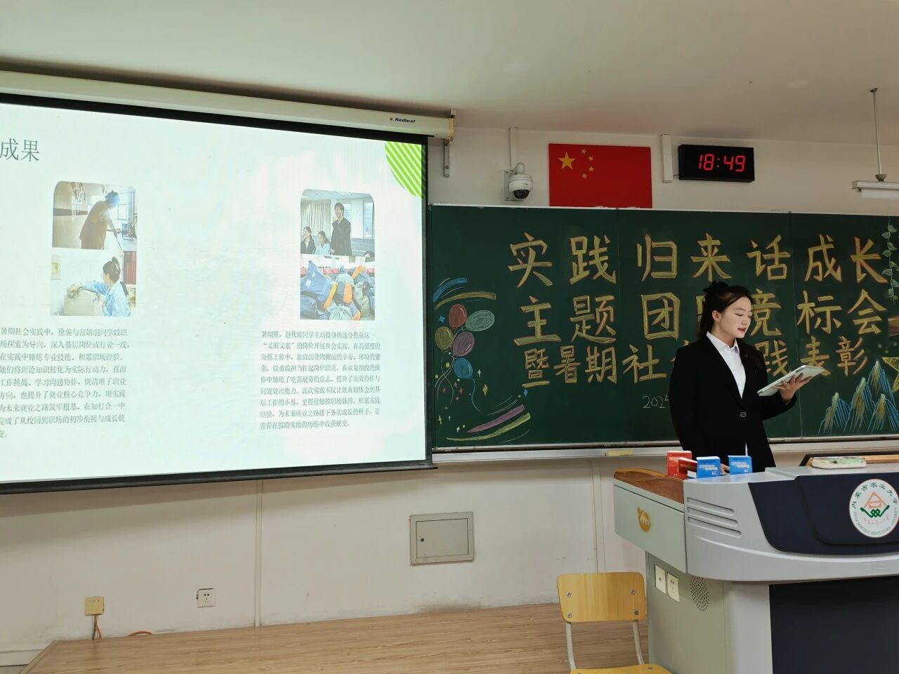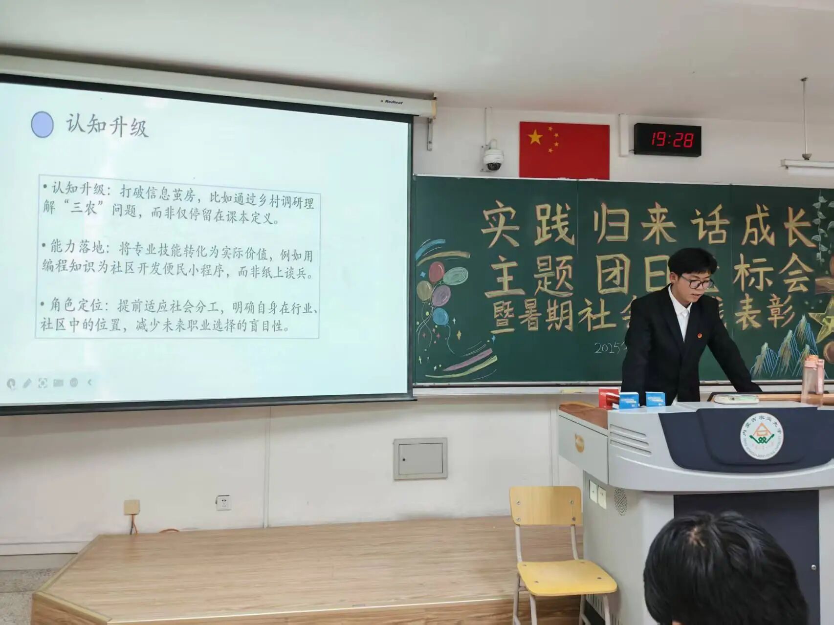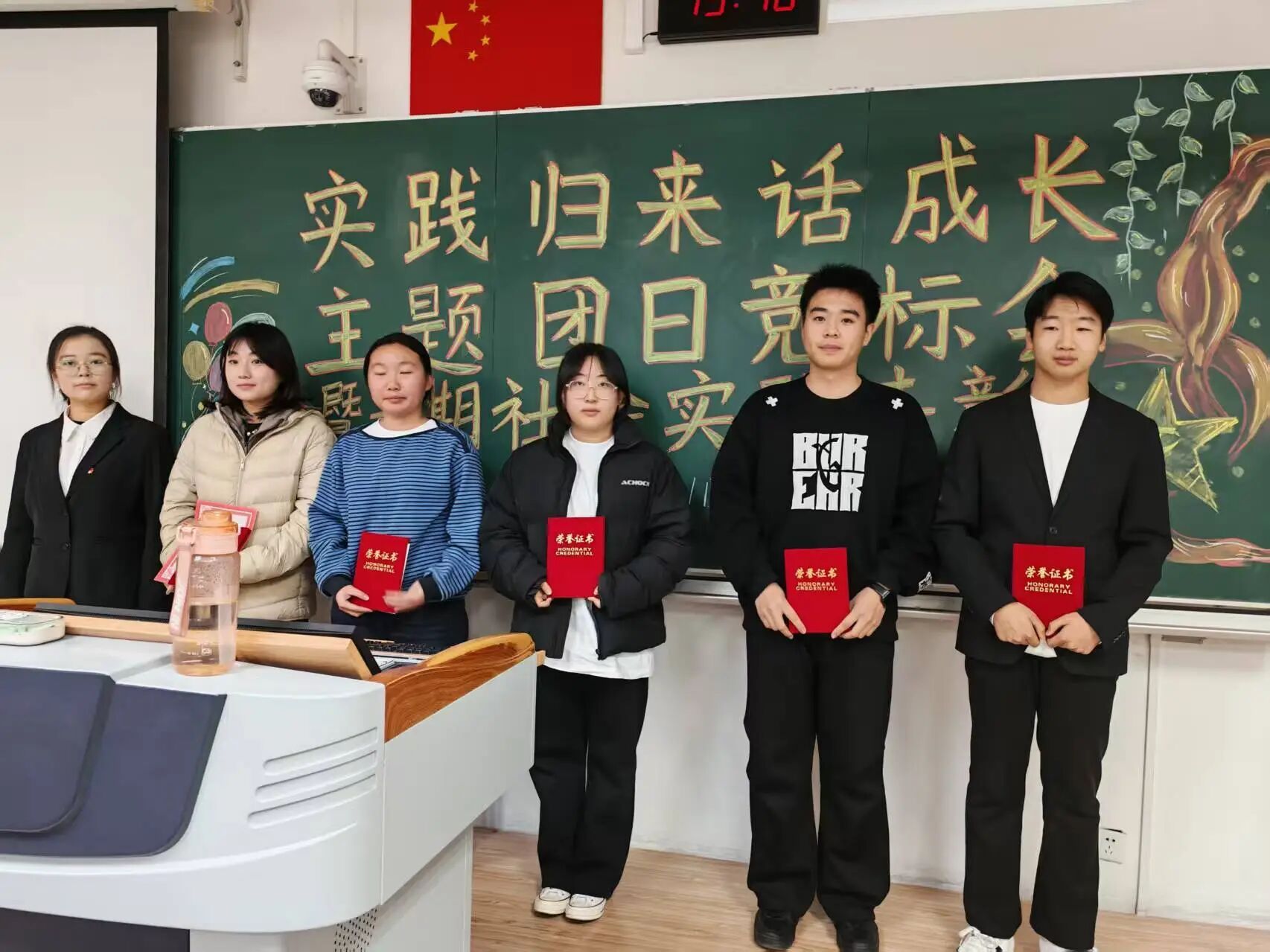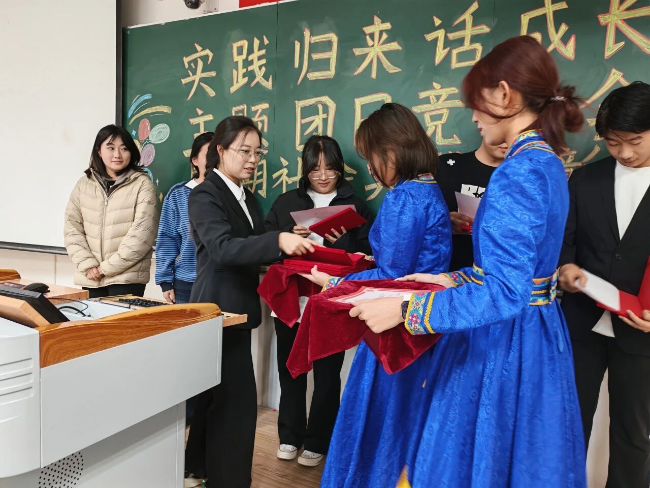 在社会实践表彰环节,优秀实践队员靳菡、戎静作为代表发言。她们表示,社会实践不仅提升了个人能力,更是对时代呼唤的回应,有效 锻炼了沟通协作与团队意识。分享结束后,学生会主席禹芙蓉为优秀实践队员代表颁发证书。