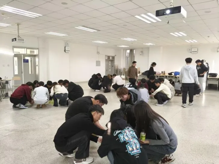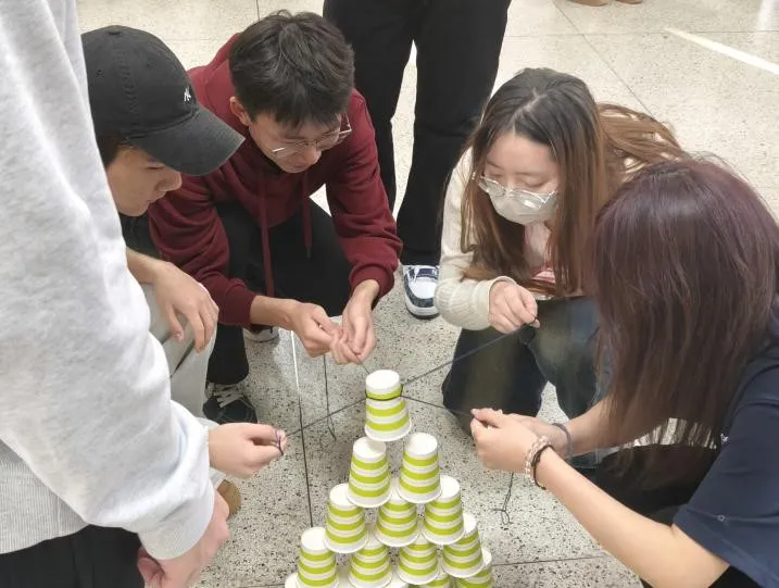 本次活动设计了系列创意互动环节。“一元五角”“夹纸竞走”“情绪雕塑家”“听歌识曲”及“方言传话”等游戏逐步展开,现场笑声不断,气氛轻松活跃。作为压轴环节的“步步高升”项目,将团队协作推向高潮:各组需利用绳控装置协作夹起纸杯并叠成高塔。同学们屏息凝神、默契配合,在策略与耐心的双重考验下成功完成挑战,深刻体会到沟通与信任在团队中的价值。