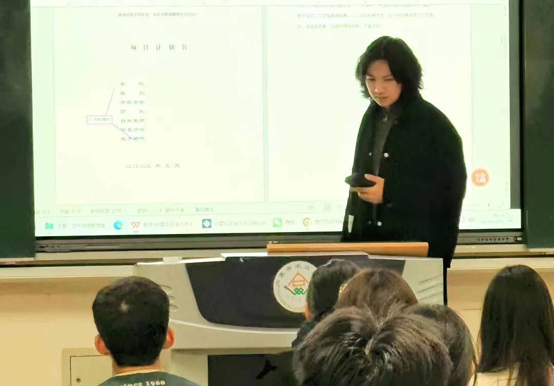 随后,创新创业中心的王佳琦聚焦“基础项目”核心要求展开讲解。她以“慧眼识农”为主题,通过PPT直观呈现项目制作的关键要点与细节规范,从选题方向到内容架构,层层拆解实践逻辑,助力新生搭建基础项目的认知框架与实践路径。紧接着,李昌泽针对策划书撰写开展专项指导。他结合标准模板,条理分明地拆解策划书各模块的核心内容与侧重点,从项目背景分析到预期成果规划,逐一讲解撰写技巧与注意事项,为新生提供“可落地、可操作”的实战指导,帮助大家精准掌握策划书制作核心能力。