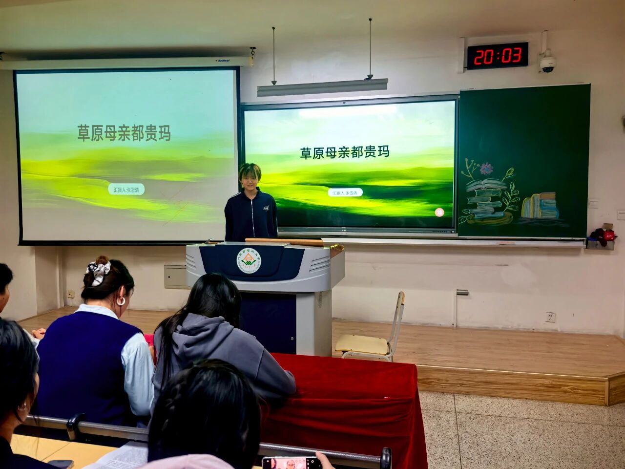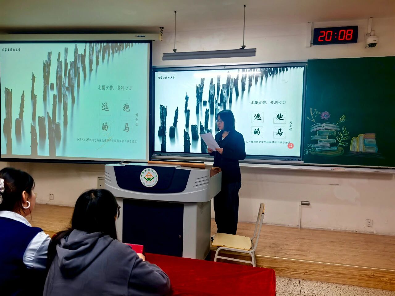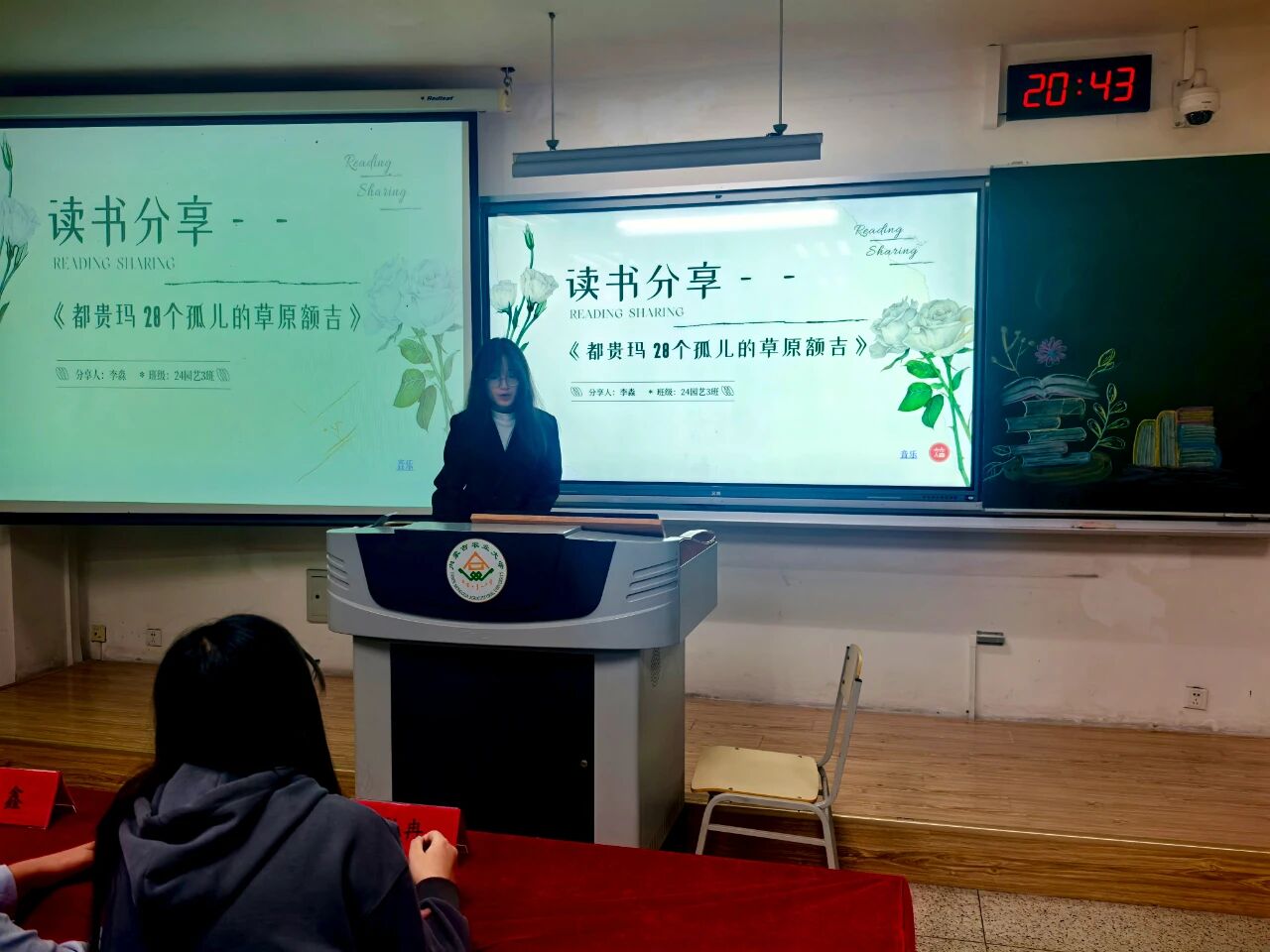活动伊始,主持人介绍了本次分享会的流程与评分规则,随后14位分享者依次登台,以书籍为纽带,串联起北疆大地的故事与情感。24级园艺一班李妍柔、24级植保二班周玥婕、25级设农一班张雪清、24级园艺一班亢雪彬、24级园艺三班李淼五位同学围绕《都贵玛:28个孤儿的草原母亲》展开分享,有人聚焦收养孤儿的日常细节,有人挖掘故事里的草原精神,让这份跨越民族的温情在多重视角中愈发鲜活;25级设农三班王学鹏、24级植保三班朱向征、24级植保三班李欣欣三位同学以《母亲》为载体,分别从成长羁绊、故土联结、亲情重量等维度,勾连起个人情感与北疆大地的人文底色;24级园艺一班李妍柔携《阿勒泰的果实》铺展新疆阿勒泰的风光与生活,25级设农一班于佳旭借《荒原筑梦》讲述北疆建设者的征程,25级设农二班宋佳俊以《准噶尔之书》追溯北疆历史脉络,25级植保二班于若菡用《逃跑的马》解锁北疆文学的灵动意象,25级设农一班赵佳琪凭《西夏王》铺开北疆王朝的历史长卷;25级设农二班郭佳瑜以《科技报国——35位科学家多信仰选择》传递北疆儿女的赤诚,23级植保三班郭一冉借《邓稼先——知识分子的榜样》致敬科研者的精神底色。选手们以真挚的情感、深刻的见解,展现了他们对书籍的独到理解与思想感悟。