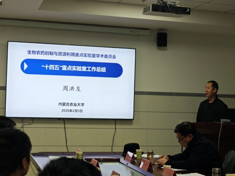 2026年2月5日,生物农药创制与资源利用高等学校重点实验室2025年度学术委员会年会在内蒙古农业大学顺利召开。会议由园艺与植物保护学院副院长杨忠仁主持,内蒙古农业大学科技处副处长蒙仲举到会指导并致欢迎词。他在致辞中阐述了重点实验室建设的宗旨与意义,并介绍了自治区在重点实验室建设方面的整体规划与布局。